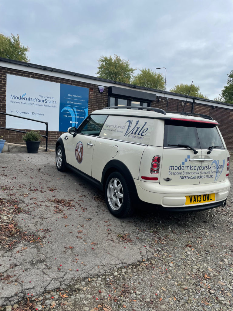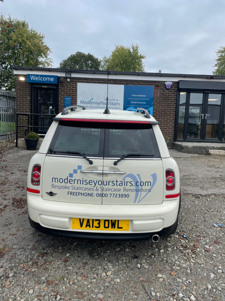The Mini Clubvan is basically a Mini Clubman but without the rear seats and the tailgate is replaced with double rear doors just like a normal van. So the space in the back is very generous and perfect for carrying our box of stair part samples like Handrails and Newel Caps to show potential clients. Basically a showroom on wheels. We also use the van to visit job sites and deliver things like glues and screws to our fitting teams if they are running short.